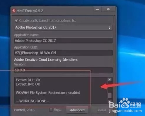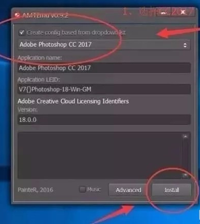 打開PS CC 2018破解文件夾,找到“Adobe破解工具.exe”,鼠標(biāo)右擊選擇【以管理員身份運行】,如下圖所示,選擇Adobe Photoshop CC 2017,再點擊【Install】