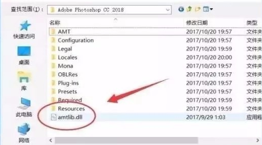 在彈出的窗口中找到PS CC 2018安裝位置,選擇下方圖中“amtlib.dll”,然后點擊【打開】