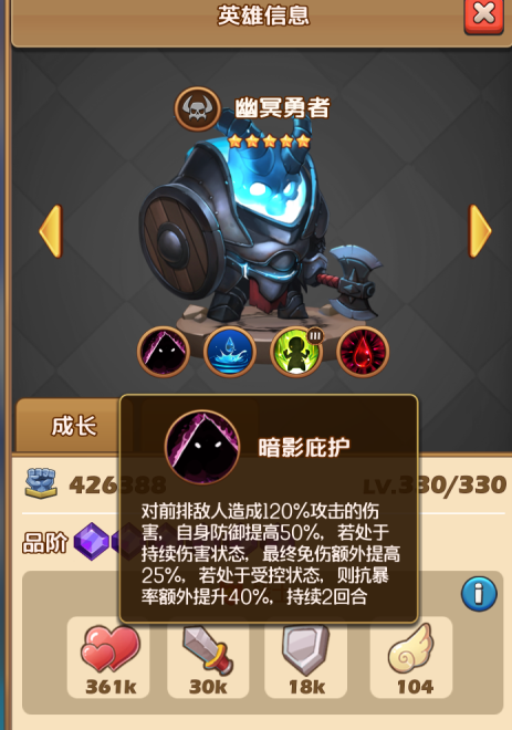 先不說技能1各種特效和50%防御加成。僅僅是第二技能:每回合50%幾率獲得1個最大生命+20%的護盾,持續(xù)1回合。就明白這位一哥有多肉了。本來就是先天成長最高的T,還加成50%防御,還有50%概率獲得20%生命的護盾。同星級,橫掃其他T,肉到對面哭都可能只能剛好破盾,然后奶一下,立刻滿血。技能3的加生命15%雖然常規(guī),卻是核心技能之一。技能4受到攻擊降低攻擊者20%攻擊,持續(xù)2回合。簡單的一個技能卻讓對面集體上了個攻擊降低20%2回合的BUFF,簡直不要太霸道。