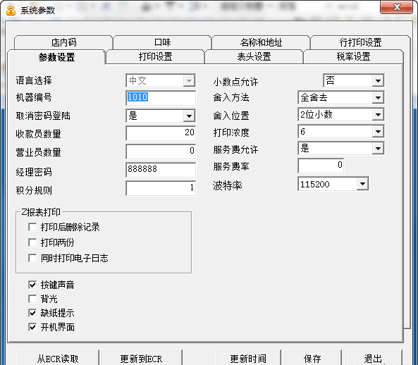 系統(tǒng)設置:系統(tǒng)參數、按鍵定義、圖片下載、通訊設置、修改密碼、收款機造字
