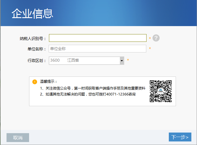 企業(yè)信息:包括納稅人識(shí)別號(hào)、單位名稱和行政區(qū)劃,設(shè)置后點(diǎn)擊【下一步】。