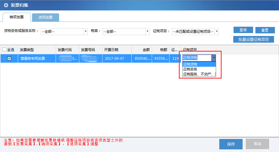 (2)銷項(xiàng)歸集:因缺失商品編碼而無法自動(dòng)歸集的銷項(xiàng)發(fā)票需要手工歸集征稅項(xiàng)目,征稅項(xiàng)目主要包括“應(yīng)稅貨物”、“應(yīng)稅勞務(wù)”、“應(yīng)稅服務(wù)、不動(dòng)產(chǎn)、無形資產(chǎn)”。針對(duì)未獲取到征稅項(xiàng)目的銷項(xiàng)發(fā)票,可以在對(duì)應(yīng)發(fā)票的征稅項(xiàng)目彈框中手動(dòng)選擇,也可以勾選多張發(fā)票進(jìn)行批量設(shè)置征稅項(xiàng)目。