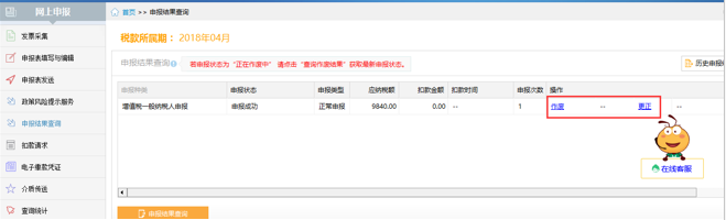 (2)作廢與更正:申報(bào)成功后,如果發(fā)現(xiàn)數(shù)據(jù)報(bào)送有誤,未扣款情況下可以點(diǎn)擊“作廢”或“更正”按鈕作廢申報(bào)記錄,作廢成功后,重新到申報(bào)表填寫與編輯頁面修改申報(bào)表數(shù)據(jù)后,重新發(fā)送申報(bào)。