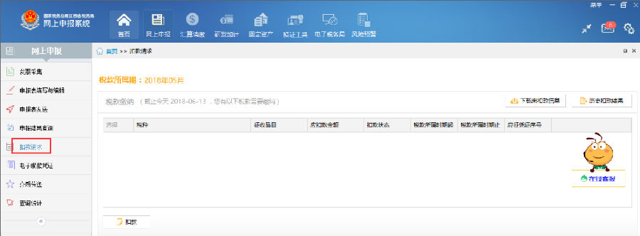 申報(bào)成功后,可點(diǎn)擊左側(cè)菜單“扣款請(qǐng)求”進(jìn)行扣款,系統(tǒng)會(huì)自動(dòng)從征管系統(tǒng)獲取待扣款信息,核實(shí)待扣款信息后,勾選中待扣款記錄并單擊扣款按鈕即可發(fā)起扣款。