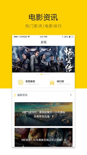 用戶也可以查看小鳥觀映人氣影院推薦,特色環(huán)境、高端設備、舒適服務,讓您體驗不一樣的觀影條件,讓您真正享受電影!