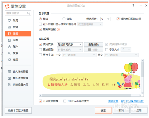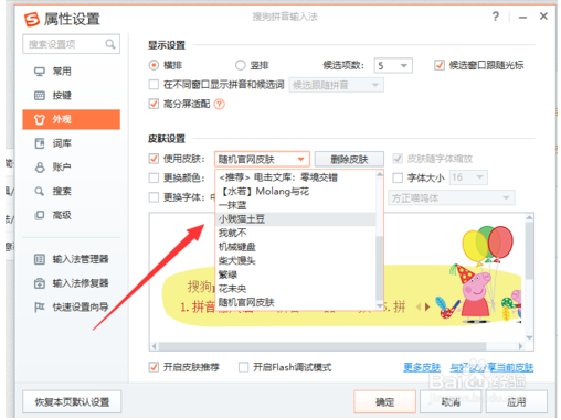 4.點擊最上邊的皮膚設(shè)置,進(jìn)入到輸入法的皮膚設(shè)置詳情里邊,可以對皮膚,文字的顏色、字體大小等屬性進(jìn)行設(shè)置。