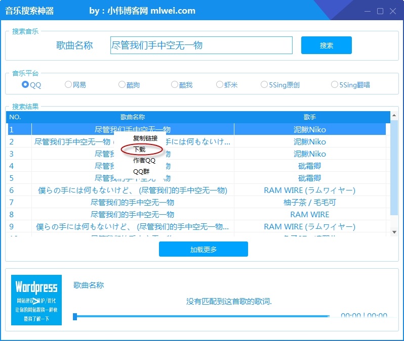 輸入歌曲名稱,選擇音樂(lè)平臺(tái),點(diǎn)擊搜索。選中所需要下載的歌曲,點(diǎn)擊右鍵下載。