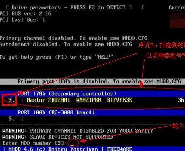 輸入序號3,然后回車確定。說明一下這個3就是mhdd工具檢測到的硬盤序列號。