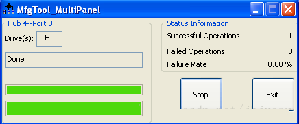 雙擊MfgTool2.exe開始運(yùn)行。這里需要注意,當(dāng)首次使用MFGTools V2版本的時候,必須將設(shè)備連好之后再運(yùn)行。MFGTools起來之后只有兩個按鈕,一個start,一個exit,如果點(diǎn)擊start開始燒寫,點(diǎn)擊后start按鈕表現(xiàn)為stop,如果start按鈕顯示為stop時不能點(diǎn)擊exit按鈕進(jìn)行退出,只有停止燒寫了才能exit,鏡像燒寫的過程會花費(fèi)一些時間,如果中途點(diǎn)擊stop,接著再點(diǎn)擊start,那么MFGTools會接著上次stop的地方繼續(xù)燒寫。不過官方不建議這樣做。