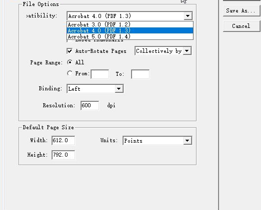 3、這里是設(shè)置的功能,可以選擇您電腦上Acrobat的版本,支持1.3、1.4版本,并設(shè)置生成的PDF大小和頁(yè)面大小
