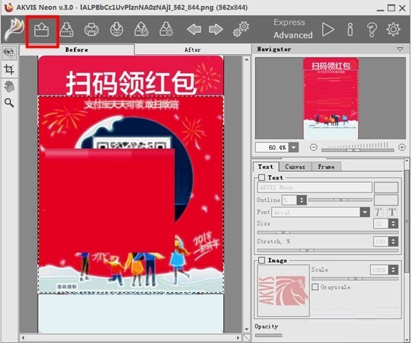4、點(diǎn)擊下圖紅框中圖標(biāo)即可選擇需要處理的圖片文件,會(huì)自動(dòng)完成霓虹燈的效果,可以根據(jù)自己的需要調(diào)整具體效果,但不影響圖片有效性,支付寶二維碼的識(shí)別都不成問(wèn)題。