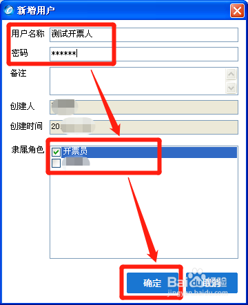 4.在“新增用戶”頁面輸入用戶名稱,我們?cè)诒纠休斎氲挠脩裘Q為“測(cè)試開票人”,輸入新開票人密碼,并賦予新增的用戶為“開票員”角色,點(diǎn)擊“確定”。