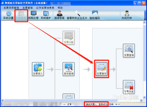 7.點(diǎn)擊“發(fā)票管理”—“發(fā)票填開”。頁面下面顯示的登錄人為測(cè)試開票人。