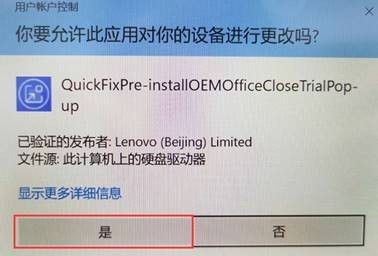 雙擊運(yùn)行“預(yù)裝OEM Office改變版本仍彈出試用窗口解決工具.EXE”,可能出現(xiàn)的用戶賬戶控制提示,請(qǐng)選擇“是