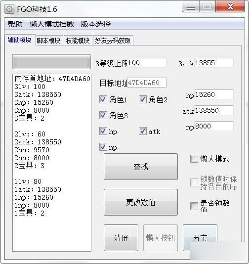 FGO科技是FGO游戲的一款游戲輔助工具,可調(diào)懶人模式檔數(shù),擁有輔助模塊、腳本模塊、技能模塊、好友PY碼獲取等功能!