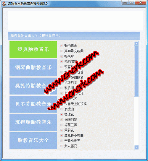 媽咪有方胎教音樂播放器共收錄了2000多首胎教音樂,基本上覆蓋了市面上所有的胎教音樂。內(nèi)容有經(jīng)典胎教音樂、鋼琴曲、莫扎特、貝多芬、班得瑞胎教音樂等,并且歌曲按拼音字母有序排列,方便孕媽媽查找。同時,軟件界面清晰,給孕婦一個輕松、愉悅的環(huán)境進(jìn)行胎教。本軟件終身免費(fèi),大小僅410kb,且為綠色版,無需安裝,直接打開即可使用。