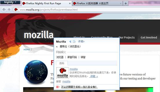 11月8日晚22點(diǎn),mozilla發(fā)布了新版火狐瀏覽器firefox8。僅半天后,有道詞典火速推出firefox8取詞特別版,首家提供firefox8屏幕取詞功能。用戶在firefox8之下,也能夠如同在文檔或其它瀏覽器中一樣輕松進(jìn)行屏幕取詞。