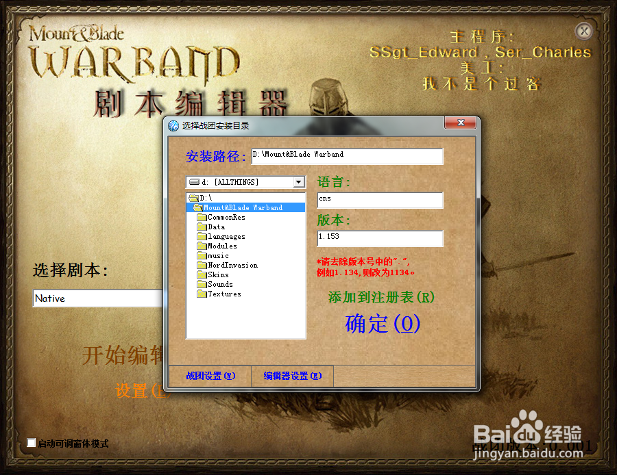 點擊"設(shè)置",選擇騎砍的安裝路徑;把語言設(shè)置為“cns”即簡體中文;版本號即你的騎砍戰(zhàn)團或者火與劍的版本號,一般來說是1.143或者1.153,注意把"."去掉。接著修改"編輯器設(shè)置",如果你發(fā)現(xiàn)你的編輯器語言不是CNS的話可以把它改回來.