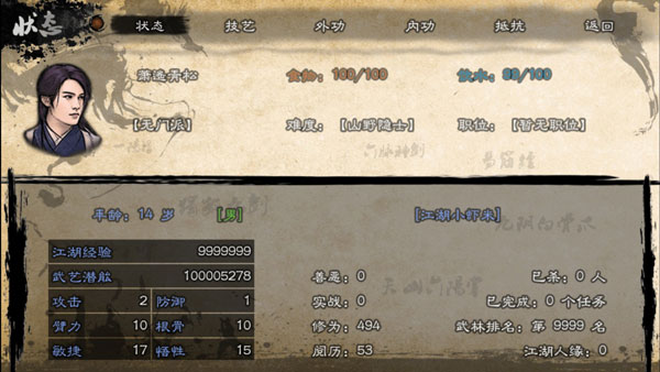 因?yàn)槌搜瞄T(mén)的任務(wù)有潛能獲得之外,其他NPC的任務(wù)并沒(méi)有,學(xué)好了基礎(chǔ)武功,把外功學(xué)到3級(jí)(外功每級(jí)加5的臂力)為拔金蛇劍做準(zhǔn)備(二代的金蛇對(duì)臂力的要求比較高需要二百,所以盡量把茶花菜刀的臂力刷高一點(diǎn),當(dāng)臂力超過(guò)一百的時(shí)候去客棧買(mǎi)酒,到地方喝醉,就可以拔了)。