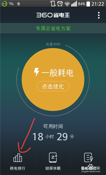 3、進(jìn)入360省電王軟件界面,點(diǎn)擊上面的“點(diǎn)擊優(yōu)化”可以將一些不使用的軟件,而在使用的CPU、內(nèi)存清除掉。點(diǎn)擊“耗電排行”查看你的手機(jī)軟件耗電排行。