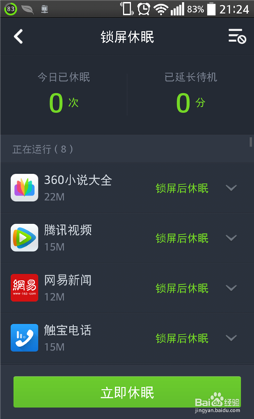 7、返回到360省電王界面,點(diǎn)擊第二個(gè)功能“鎖屏休眠”進(jìn)入之后可以選擇一些程序在你的手機(jī)鎖屏狀態(tài)下進(jìn)行休眠,不進(jìn)行任何活動(dòng)。開啟休眠即可。