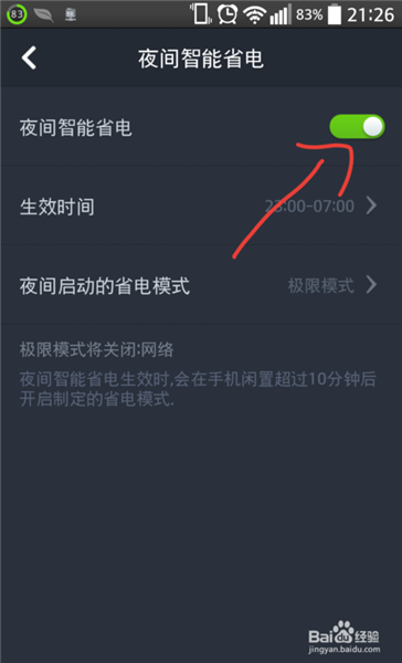 11、點(diǎn)擊開啟,可以生效時(shí)間段,以及使用什么樣的省電模式。點(diǎn)點(diǎn)滴滴節(jié)省了電量了,也延長了鋰電池的使用的壽命。