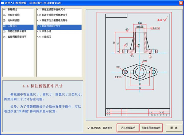 什么是"引導(dǎo)型"教程?就是軟件通過閃動(dòng)框、提示說明等,引導(dǎo)用戶完成某個(gè)圖形繪制。用戶只需跟著軟件提示、按軟件要求點(diǎn)擊鼠標(biāo)或鍵盤就行,相當(dāng)于老師手把手教您繪圖。跟著軟件做,不用考慮那些所謂"專業(yè)名詞",多做幾遍,想不會(huì)都難。該教程是目前最具創(chuàng)意、技術(shù)含量最高的自學(xué)幫助教程。與常見視頻教程差別: