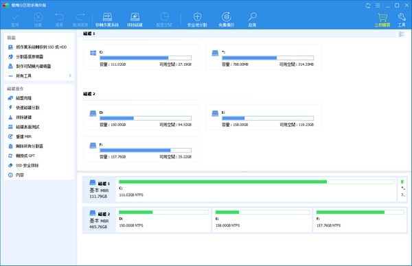 1.調(diào)整分區(qū)大小支持無損數(shù)據(jù)擴(kuò)大分區(qū)、縮小分區(qū),劃分分區(qū)的容量給另一分區(qū),合并、拆分分區(qū)等。