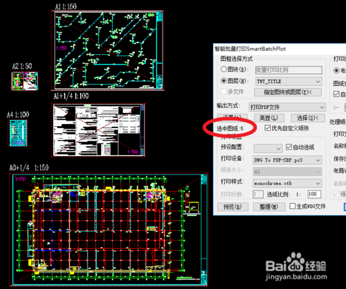 選擇要打印的圖紙,被選中的會(huì)亮顯??梢钥吹嚼永锏膱D紙大大小小,尺寸和比例都不同。注意未注冊(cè)時(shí)一次最多能選5張圖紙。