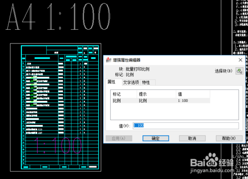4.如果打印的圖紙比例不同,需要智能識(shí)別時(shí),需要在每一張圖的范圍內(nèi)有增強(qiáng)屬性塊,標(biāo)記包含有“比例”,內(nèi)容設(shè)定為需打印的比例,這樣插件就可以識(shí)別設(shè)計(jì)的圖紙比例了。