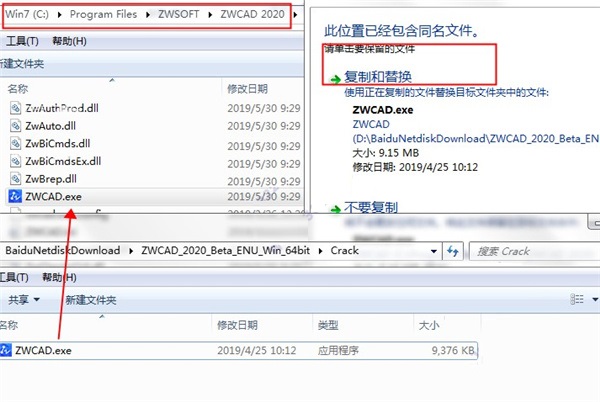6、打開crack文件,將“ZWCAD.exe”復制至“C:\Program Files\ZWSOFT\ZWCAD 2020”路徑下,選擇替換。