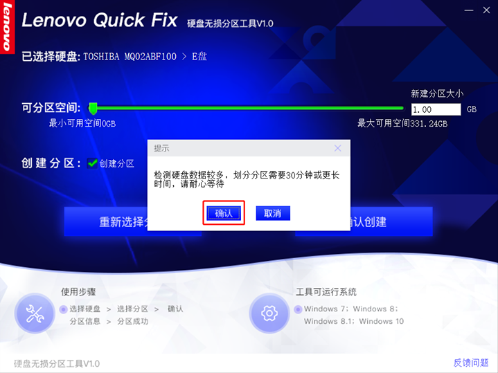 點擊上圖確認創(chuàng)建,軟件提示正在創(chuàng)建分區(qū)(注意:如果待分區(qū)硬盤上存儲的數據比較多,首次運行本軟件會需要較長的時間,請耐心等待執(zhí)行完成),彈出提示如圖: