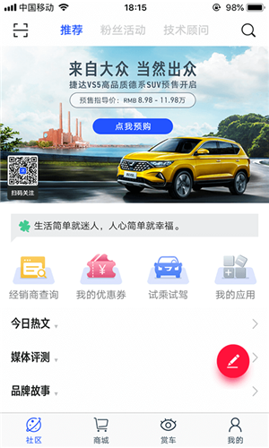JETTA捷達app是一款一汽大眾捷達品牌車主app,JETTA捷達app是專為大眾汽車粉絲或者用戶們打造的綜合服務應用,JETTA捷達app匯聚了眾多車友發(fā)布的動態(tài)信息,讓你看到大眾汽車之美;眾多相關資訊文章讓你看到大眾汽車品牌的獨特姿態(tài)。