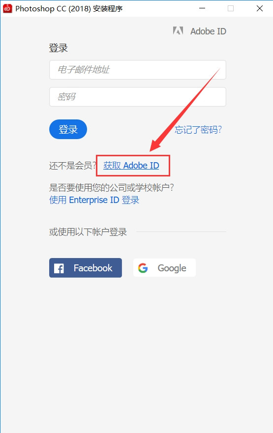 4.首次安裝的時候我們需要注冊一個賬號,點擊【獲取Adobe ID】;已經(jīng)有賬號的用戶可以直接登陸。