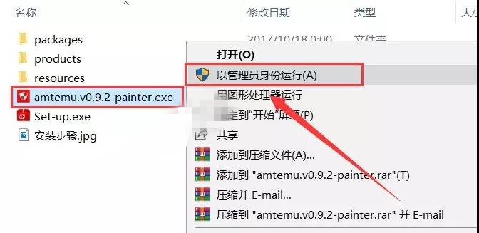 16.打開之前解壓后的【PS2018 X64bit】文件夾,選中【amtemu.v0.9.2-painter】可執(zhí)行文件,鼠標(biāo)右擊選擇【以管理員身份運行】。溫馨提示:若打開后沒有amtemu.v0.9.2-painter文件,則需要關(guān)閉你電腦殺毒軟件和防火墻后再重新解壓安裝包后打開。