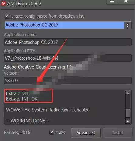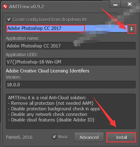 17.點擊下拉菜單選擇【Adobe Photoshop CC 2017】,然后點擊【Install】。