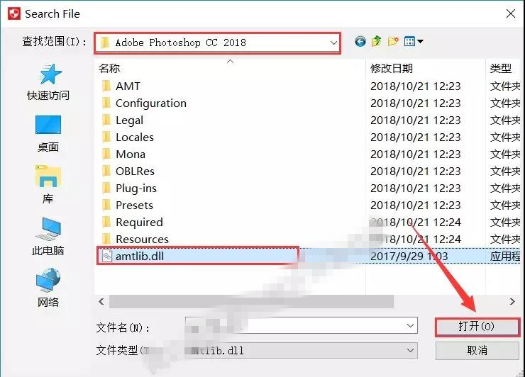 18.查找范圍就去之前粘貼后的磁盤找【Adobe Photoshop CC 2018】文件夾,然后選擇【amtlib.dll】文件后點擊【打開】。