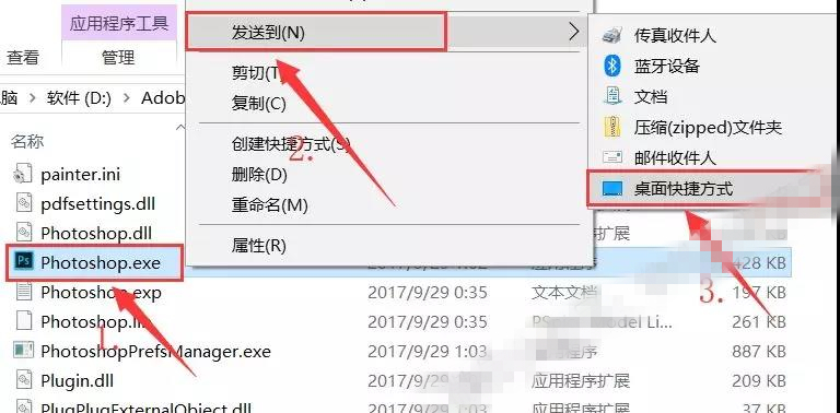 21.找到【Photoshop.exe】程序后,鼠標(biāo)右擊【Photoshop.exe】依次選擇【發(fā)送到】、【桌面快捷方式】。