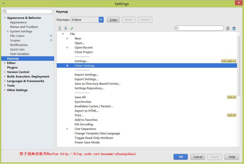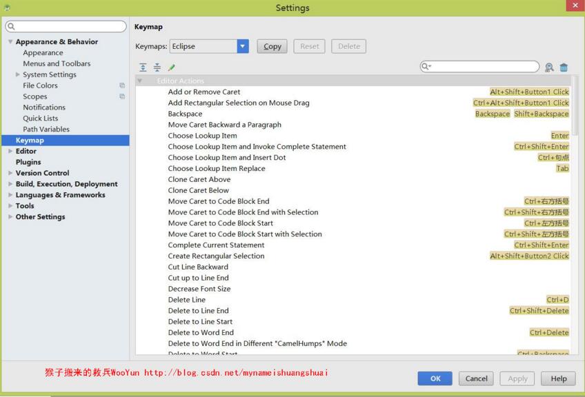 首先你可以在Android Studio中使用Eclipse的快捷鍵。也可以單獨設置: Settings –> Keymap 。從 Keymaps 中選擇對應IDE的快捷鍵,Android Studio對其他IDE的快捷鍵支持還是比較多的。建議不使用其他IDE的快捷鍵,而是使用Android Studio的快捷鍵。