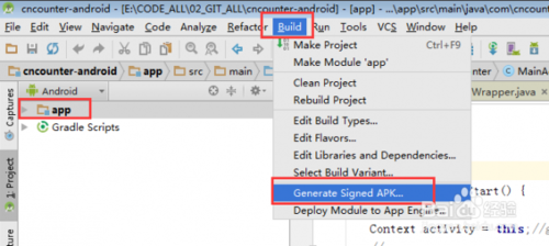 AS中,點擊項目,選擇Build菜單, 然后選擇Generate Signed APK。如下圖所示:Build->Generate Signed APK...