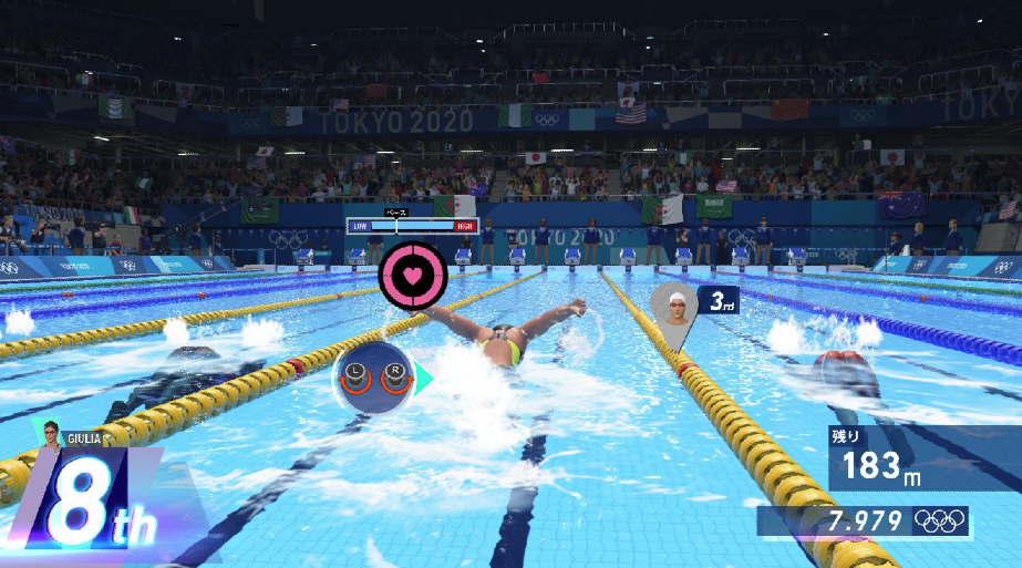 好像揮動(dòng)運(yùn)動(dòng)員左右手般快速地?fù)u動(dòng)左右操作搖桿,這樣就能消耗體力游得更快,而慢速搖動(dòng)則可保留體力來(lái)游泳。要在哪個(gè)階段保留體力、在哪個(gè)階段沖刺才好呢?控制體力就是本競(jìng)技的關(guān)鍵。