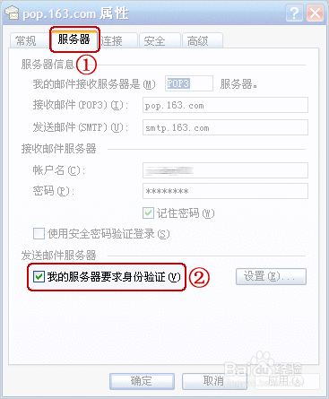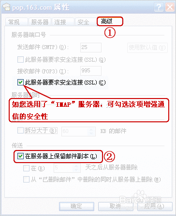 注:如您選用了“IMAP”服務(wù)器,可將“此服務(wù)器要求安全鏈接(SSL)”打勾,這樣所有通過IMAP傳輸?shù)臄?shù)據(jù)都會(huì)被加密,從而保證通信的安全性;