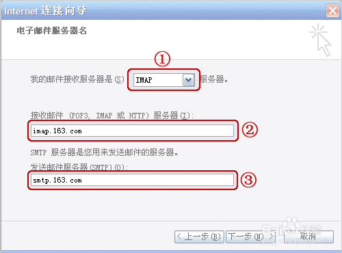 如果您選擇IMPA服務(wù)器:請(qǐng)輸入您郵箱的的IMAP和SMTP服務(wù)器地址后,再點(diǎn)擊“下一步”,如下圖所示: