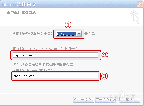 如果您選擇POP3服務(wù)器:請(qǐng)輸入您郵箱的的POP3和SMTP服務(wù)器地址后,再點(diǎn)擊“下一步”,如下圖所示: