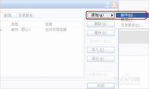 點(diǎn)擊“郵件”標(biāo)簽,點(diǎn)擊右側(cè)的“添加”按鈕,在彈出的菜單中選擇“郵件”,如下圖所示: