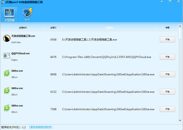 1、下載雙擊“天狼進(jìn)程隱藏工具.exe”直接運(yùn)行軟件2、選擇需要隱藏的軟件進(jìn)程,點(diǎn)擊“開啟”使用隱藏功能