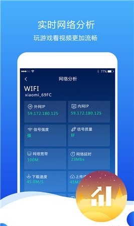 5.網(wǎng)絡(luò)分析,智能分析當(dāng)前網(wǎng)絡(luò)狀況IP、信號、帶寬、延時、下載、上傳等數(shù)據(jù)