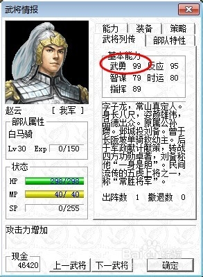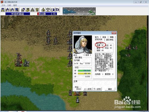 1、這里隨機(jī)選取了一個(gè)戰(zhàn)棋類游戲做演示,我們要修改的是子龍同學(xué)的武力值。如下圖所示,子龍同學(xué)的武力設(shè)置為97,現(xiàn)在我想把它改為100。