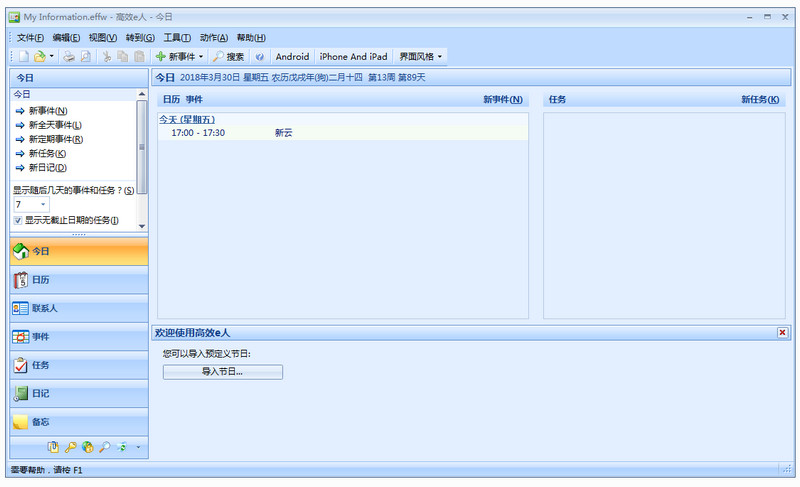 高效e人專業(yè)版(EfficientPIM Pro )是一款個(gè)人信息管理軟件,可以幫助用戶記錄任務(wù),聯(lián)絡(luò)人,提醒事項(xiàng),密碼和日記等信息。高效e人提供的大多數(shù)標(biāo)準(zhǔn)的PIM功能,如周期性活動(dòng),進(jìn)口假期,導(dǎo)出為HTML ,任務(wù)管理和提醒,需要的朋友歡迎下載使用。【軟件特點(diǎn)】