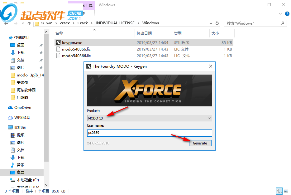 2、默認(rèn)選擇modo 13,下方的名字隨便輸入,小編輸入pc0359,點(diǎn)擊generate計(jì)算許可證